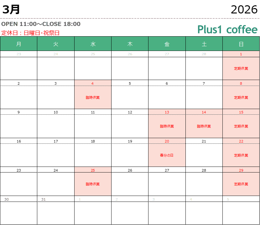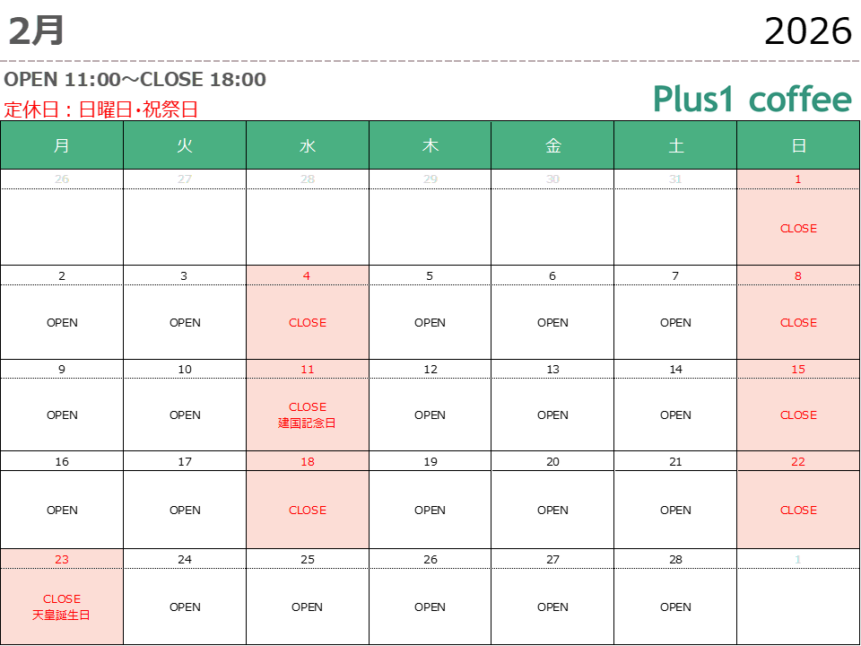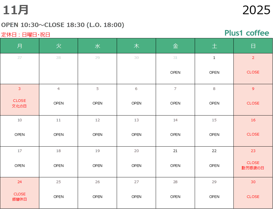 | 店舗名 | Plus1 coffee |